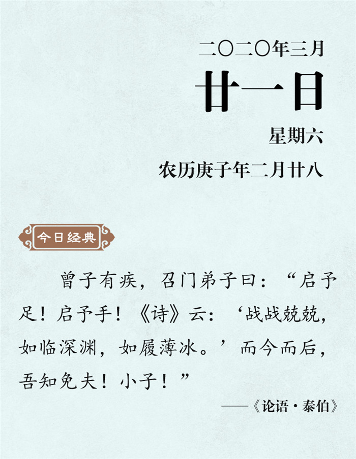 重病卧床之际,让弟子们看看他的手,看看他的脚,看什么呢?手动不了了,脚动不了了,什么事也做不了了,一般人到了这种地步,可能会遗憾万分,但曾参却如释重负:我再也用不着战战兢兢了,我再也不会有如临深渊、如履薄冰那种惶恐不安了。“而今而后,吾知免夫”,是一脸无奈,也是一身轻松。