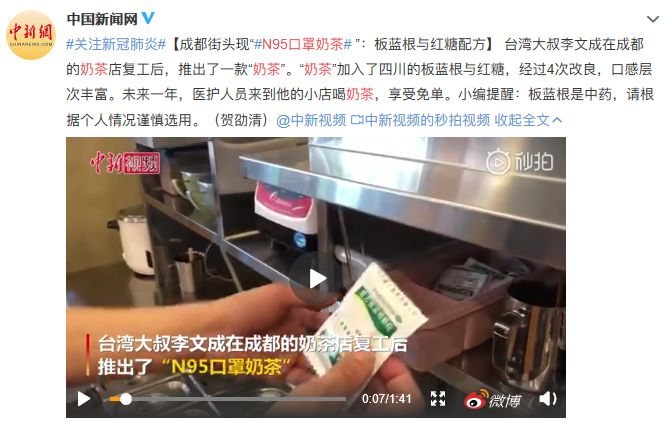 “N95口罩奶茶”内含药物板蓝根,成都市监部门:将查处