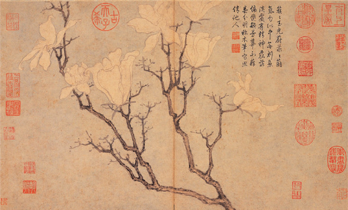 玉兰花雍容大气,明代常以“玉雪霓裳”指代四大美女之一的杨玉环。沈周的学生文徵明在“咏玉兰”诗中也引用此典,“我知姑射真仙子,天遗霓裳试羽衣” “玉环飞燕元相敌,笑比江梅不恨肥。”《白玉兰图卷》是文徵明80岁时所做。图中玉兰向两侧伸展,一侧花枝斜出,枝干自然弯曲,枝上花朵相继开放;向上枝杆只露部分,却有一细枝枝头攒满洁白花朵。“影落空阶初月冷,香生别院晚风微。”晚风吹过,玉兰馥郁的香气弥漫于庭院之中,又有一番无限温馨的感觉。