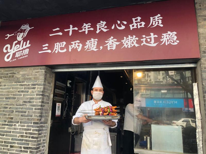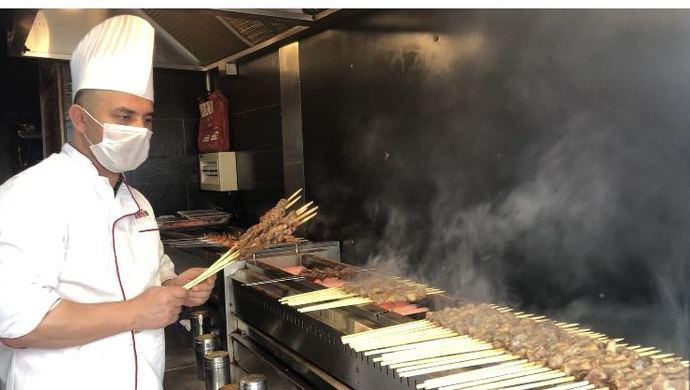 中午11时,羊肉烧烤门面孜然飘香,吸引了不少人驻足,维吾尔族80后青年巴克从烤炉里拿出一串热腾腾的“烤爸爸”(土耳其烤肉),铁签上的鸡肉、茄子外焦里嫩、分外诱人。他是位“老上海”,在耶里夏丽工作近10年,是店里的三级厨师,厨艺精湛。巴克边上的阿布都正老练地翻烤着羊肉串,一位穿红衣的姑娘一口气点了四串烤羊肉,“两个多月没有吃了,今天过把瘾!”