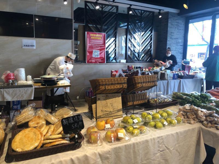 台面上摆着绿色蔬菜、阿克苏苹果、库尔勒香梨等瓜果。“我们这里的蔬菜性价比很高,是松江基地出品,很便宜,比如蓬蒿,一元一把。” 龚青说,开新零售店就是想和居民保持互动,这也是疫情催生出来的机会,“顾客如果有顾虑,不能来堂吃,可以在这里选一两样半成品回家,一样有耶里夏丽的味道。“