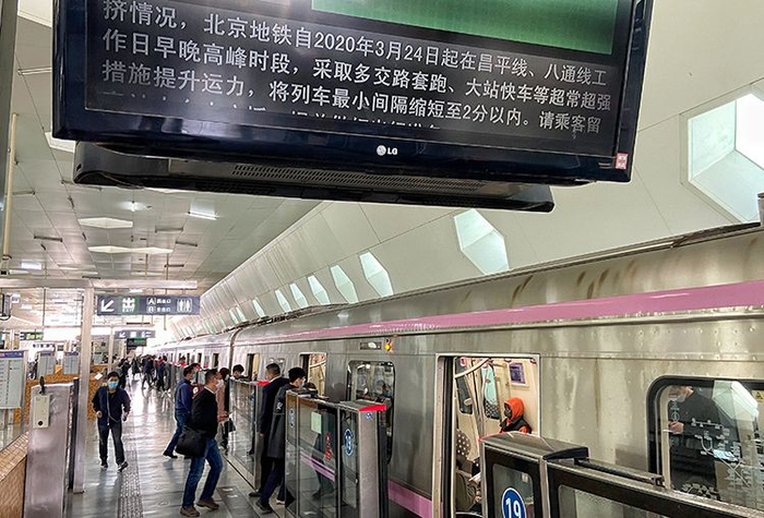 新京报讯 随着企业陆续复工,从上周开始,多条地铁在早高峰时段拥挤度纷纷“飘红”。为此,从3月24日开始,昌平线和八通线先行使用超常超强列车运行图,昌平线最小运行间隔缩至2分钟,八通线最小运行间隔缩至1分58秒。此外,还将开行大站快车和多交路套跑区间车,最大程度降低高峰小时列车满载率。
