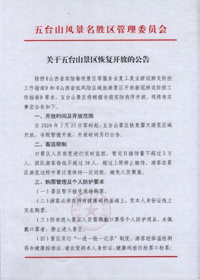 自2020年3月25日零时起,山西五台山风景名胜区恢复露天游览区域开放,寺院暂缓开放,开放时间另行公告。其中,对景区人员密度进行实时监控,暂定日接待量不超过2万人,团队游客每批不超过30人,超过上限停止接待。游客在景区游览过程中要注意保持一定间距,避免人员聚集。