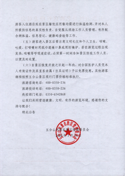 自景区恢复开放之日起一年内,对全国医护人员凭本人有效证件及其直系亲属(出具证明)予以免票优惠。其他游客继续按照五台山景区现行门票价格标准执行。