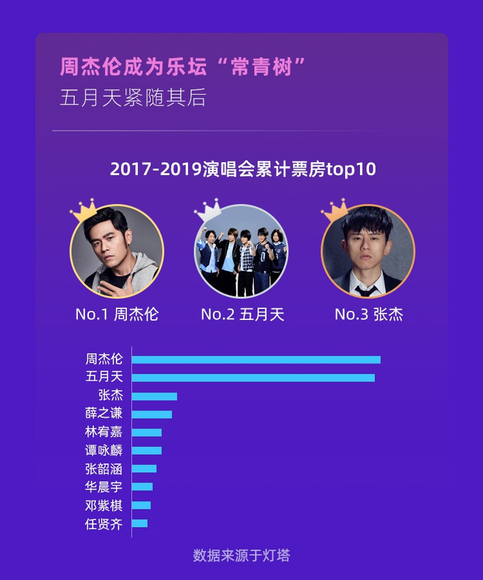 2019年,林俊杰成为演唱会巡演城市最多的艺人,当选年度“劳模”,李宗盛、李荣浩紧随其后。周杰伦成为近三年演唱会“票房冠军”,五月天、张杰分列第二名和第三名。与此同时,乐坛新生力量异军突起,报告显示,2019年TFBOYS、摩登兄弟、UNINE等艺人拉新能力最强,年轻一代用户更愿意为“爱豆”演出埋单。