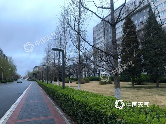 北京今晨天空阴沉,地面湿润。