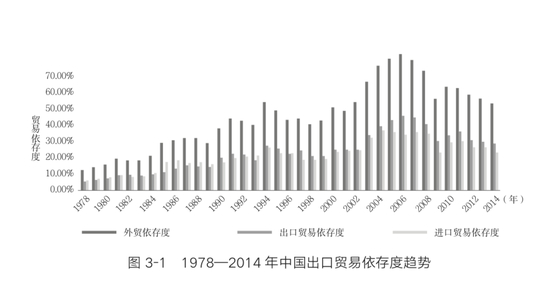 可以简单看一下中国自改革开放以来外贸依存度的变化,图3-1是1978—2014年的变化过程。