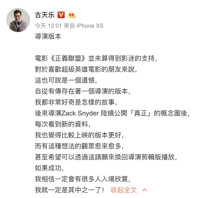 原标题:古天乐发文希望发行《正义联盟》导演剪辑版
