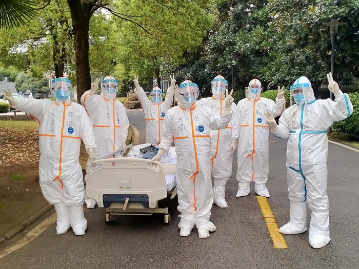 上海第一批支援湖北医疗队部分队员在金银潭医院隔离病房合影