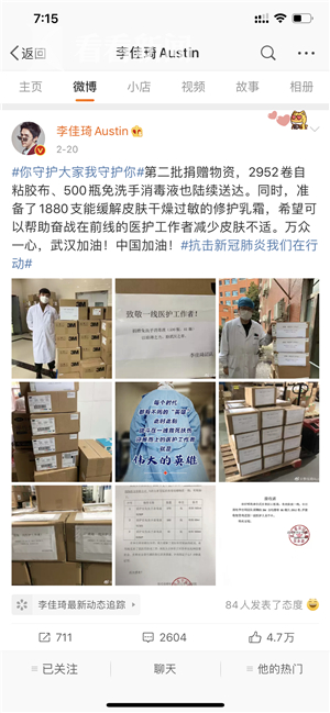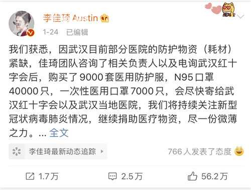 这并不是李佳琦及其团队第一次为湖北疫情进行捐助。1月24日,李佳琦在微博表示,其团队咨询了相关负责人以及电询武汉红十字会后,购买了9000套医用防护服,N95口罩40000只,一次性医用口罩7000只。1月27日,第一批9000套医用防护服已经于当日中午送达武汉同济医院。2月20日,第二批捐赠物资,2952卷自粘胶布、500瓶免洗手消毒液也陆续送达武汉。同时团队还准备了1880支能缓解皮肤干燥过敏的修护乳霜,希望可以帮助奋战在前线的医护工作者减少皮肤不适。