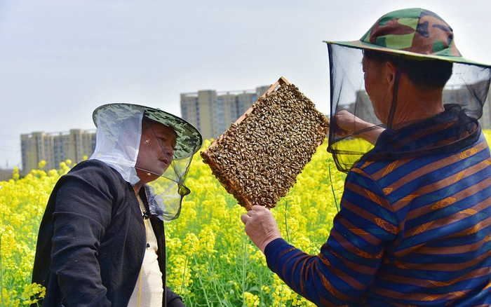 ,江苏南通,养蜂人查看蜂巢。图/视觉中国