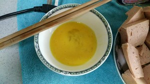 4. 将午餐肉蘸满鸡蛋液,然后裹上燕麦。有条件的话,先裹淀粉再裹鸡蛋液、燕麦会更好;