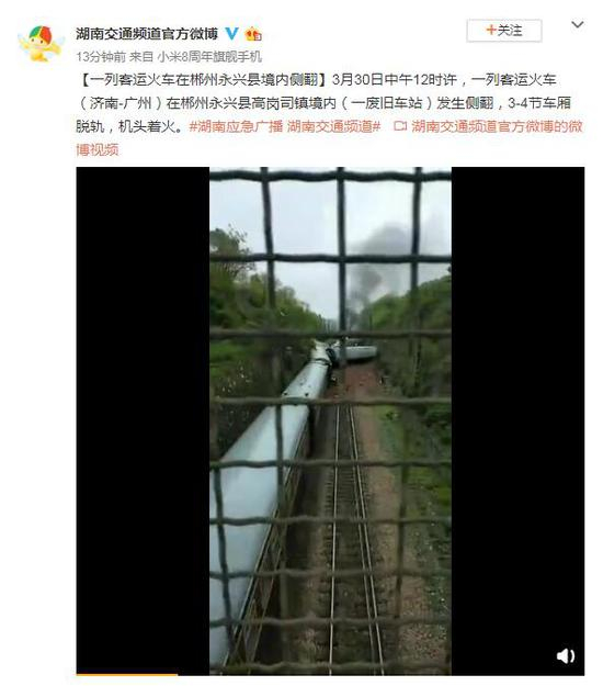 另据湖南交通频道官方微博消息:一列客运火车在郴州永兴县境内侧翻