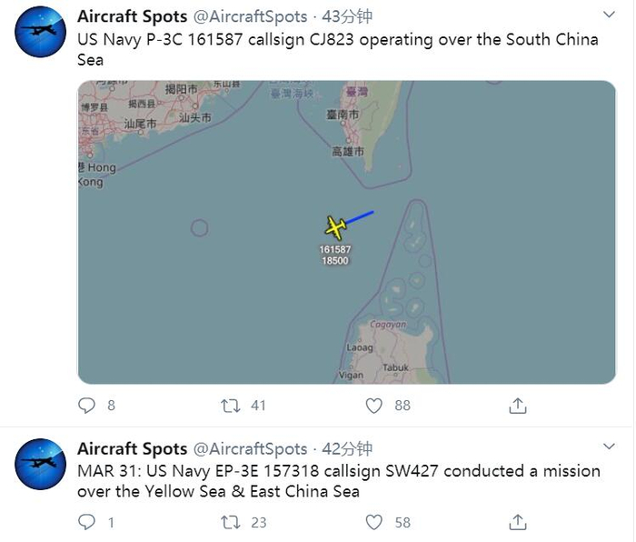 [环球网报道 记者 徐璐明]3月31日,据长期追踪美国军机动向的社交帐户Aircraft Spots发布的消息显示,一架编号为161587的美国海军P-3C巡逻机在中国南海海域上空飞行,同一天,还有一架编号为157318的EP-3E电子侦察机在中国东海和黄海海域飞行。美国军机在一天之内同时进入南海、东海和黄海上空的情况并不多见。
