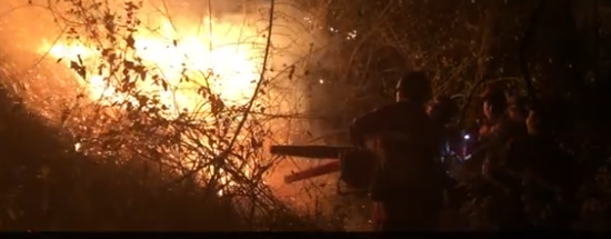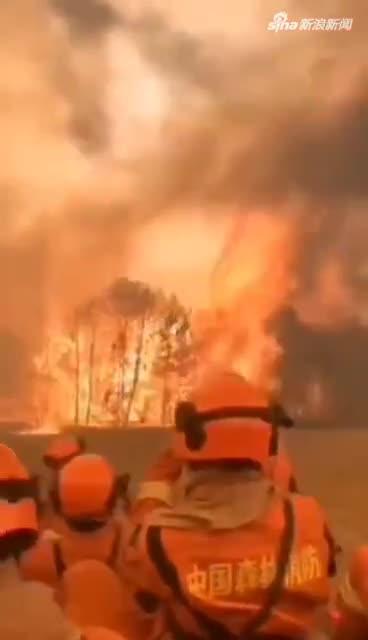 很多视频通过社交媒体传遍了西昌人的朋友圈,刘潘发给我一段,其中是数十名森林消防队员,匍匐在一片空地上,看起来像是被火焰包围了一样,为首的一名消防队员手持望远镜向前观察火情,并朝后面喊话,“退一点、再退一点。”