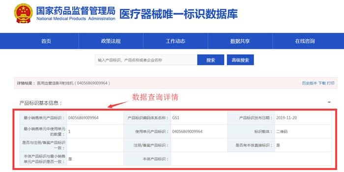 2019年12月10日,医疗器械唯一标识数据库正式上线。此次数据共享是为了方便社会公众查询,满足用户多条件、多角度的查询要求。数据查询详情按产品标识不同特点展示,同时设置了查询数据的折叠或展开、下载、打印、历史版本记录等辅助功能,满足用户多样化需求。