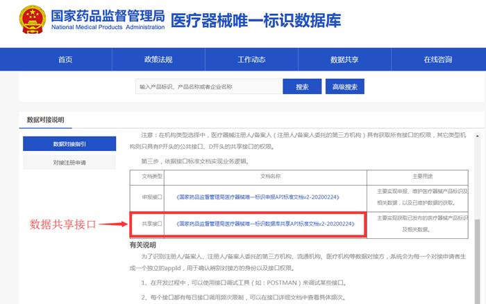 医疗器械唯一标识数据库设置接口对接的数据共享方式,点击首页“数据对接说明”栏目,在线填报对接申请并获取对接授权码。下载《国家药品监督管理局医疗器械唯一标识数据库共享API标准文档》最新版,按文档要求开发对接功能,经联调测试通过后,用户可通过接口获取数据。