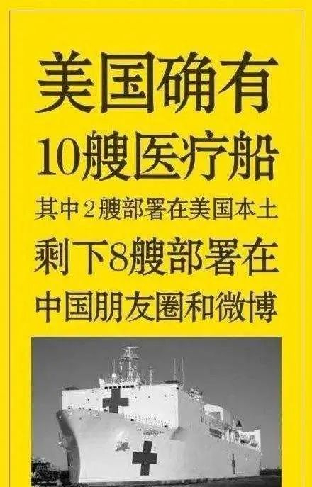 可是,美国海军只有两艘。此前,中国国内一些“媚美派”吹嘘,美军一艘医疗船就相当于武汉的雷神山医院。而且,美国人都不用花8天时间去建造,直接开过来就行——“美国10艘医疗船将全部出动,一举解决美国各地医院床位紧张的问题”。