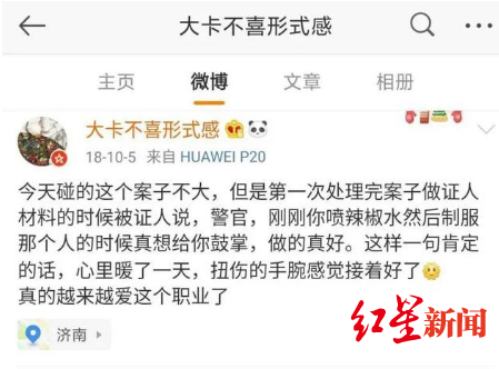在于忠元的微博里,有许多他的生活照或身着制服时的正装照,其中一条发自1月8日的博文里,于忠元配了2张照片,一张是受助乘客向他赠锦旗的合影,另一张则是他获得济南铁路公安局济南公安处授予“2019年度优秀人民警察”的荣誉证书。