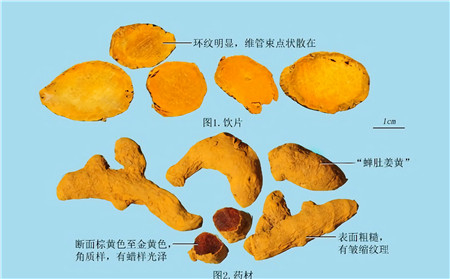 姜黄:呈不规则卵圆形、圆柱形或纺锤形,常弯曲,有的具短叉状分枝,长2~5cm,直径1~3cm。气香特异,味苦、辛。破血行气,通经止痛。用于胸胁剌痛,闭经,症瘕,风湿肩臂疼痛,跌扑肿痛。主产于四川、广东、福建、广西等地。