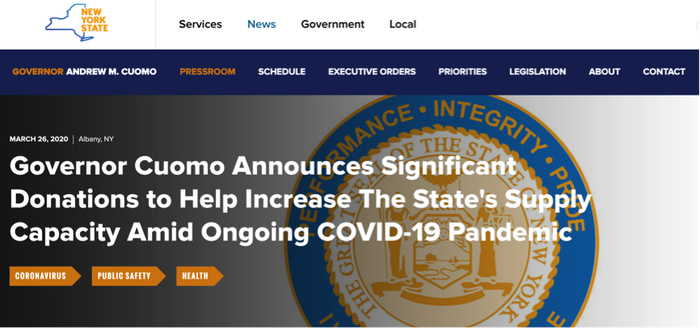 3月26日,纽约州州长安德鲁·库莫在政府官网发文表示感谢,称已收到众多大型公司、慈善组织和各界名人捐赠的防疫物资。在捐赠清单中,华为公司位列其中。