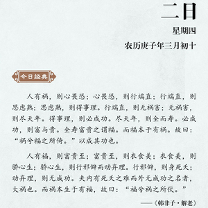 韩非在解释祸福之间的转化时指出:祸患引发人的畏祸心理,畏祸心则督使人们行事正直、思虑成熟,结果反而因祸得福;反过来,福滋生了人的骄惰心理,而骄惰之心表现在行为上就是行为举止悖逆常理,反而招致祸端。著名的“塞翁失马”,说的正是这个意思。