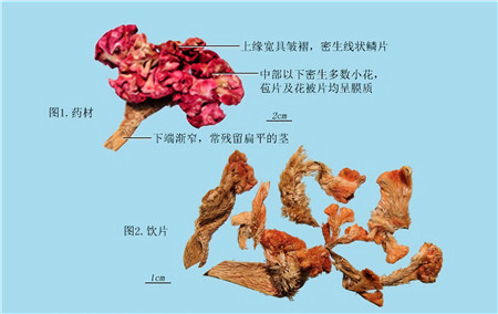 鸡冠花:为穗状花序,多扁平而肥厚,呈鸡冠状。长8~25cm,宽5~20cm,最大直径40cm。体轻,质柔韧。无臭,味淡。收敛止血,止带,止痢。用于吐血,崩漏,便血,痔血,赤白带下,久痢不止。原产非洲,美洲热带和印度,现我国大部分地区有栽培。