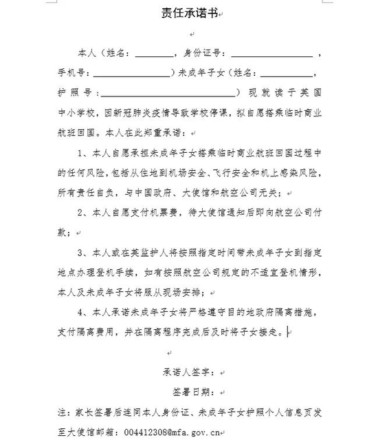 在3月16日国外疫情急剧恶化之际,英国小留学生的家长就向中国驻英国大使馆发送了《关于对滞留在英国的未成年中国小留学生开展领事保护的申请》,请求国家协助将未成年中国留学生接回国内。而3月31日开始网络上流传的一份责任承诺书透露中国驻英国大使馆将会组织包机回国,机票费用与隔离费用自理,并承诺服从一切安排。
