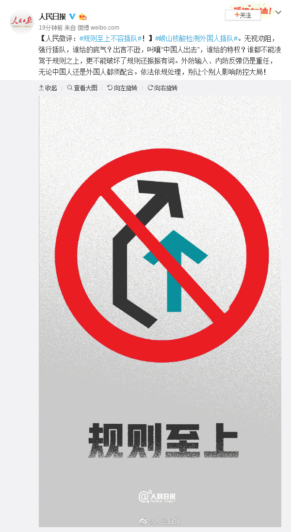 崂山核酸检测外国人插队,无视劝阻,强行插队,谁给的底气?出言不逊,叫嚷“中国人出去”,谁给的特权?谁都不能凌驾于规则之上,更不能破坏了规则还振振有词。外防输入、内防反弹仍是重任,无论中国人还是外国人都须配合。依法依规处理,别让个别人影响防控大局!