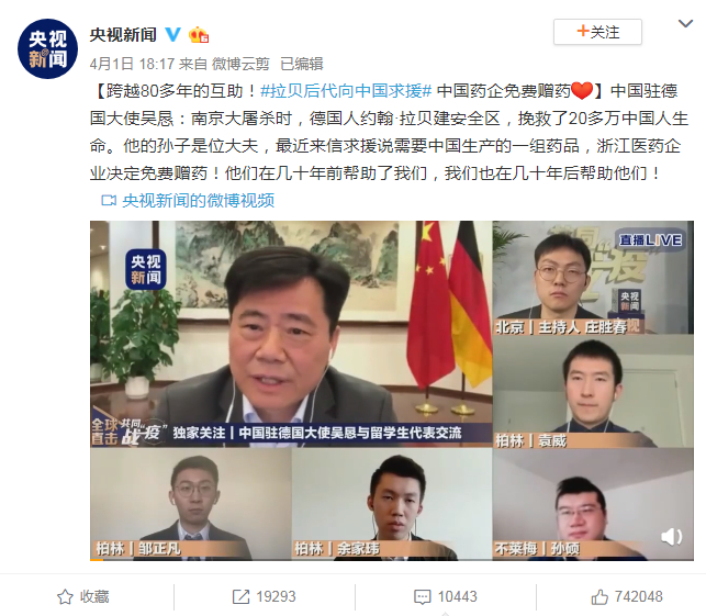 4月1日,中国驻德国大使吴恳做客央视新闻新媒体《共同战“疫”》节目,就德国疫情现状、防疫物资紧缺等问题与在德中国留学生“隔空对话”。节目中,吴恳提到一段历史故事,不仅让参与连线对话的留学生十分感动,更是打动了很多网友,让这段故事在一天之内冲上微博热搜。