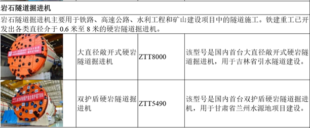 分拆上市预案修订稿披露的铁建重工主要产品。