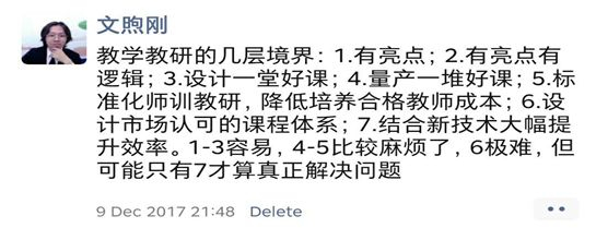 文老师说,备好一节课,和备好一百节课,不是一个概念,量产100节80分的课,要比一节课95分、其余99节课70分难得多。量产好课不能只靠灵感,必须有明确标准和方法论,需要积累很多年,更需要借助新兴技术手段。