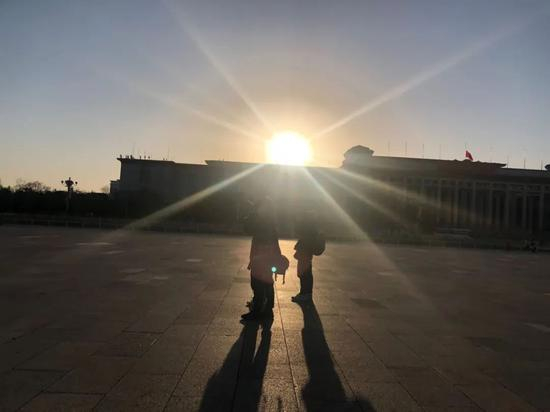 太阳好像是突然从国家博物馆后面跳了出来,逆着阳光抬头看,国博顶上的五星红旗也降下了半旗。