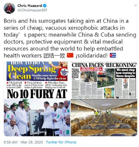 此外,英国前内阁办公室大臣达米安·格林(Damian Green)公开指责疫情问题出于中国,主张以当年冷战时期对待苏联的方式处理与中国的关系。英国议会外交事务委员会主席汤姆·图根哈特(Tom Tugendhat)也频繁在英国的电视、报纸和广播等各种媒体上煽风点火,罔顾事实,诋毁中国抗疫斗争。