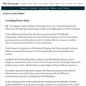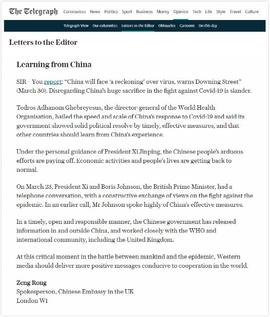 英国《每日电讯报》于4月2日刊登了一封来自中国驻英国使馆发言人的读者来信,驳斥该报近期刊发的一篇关于新冠疫情下“清算中国论”文章。称该文罔顾中国为世界抗击新冠肺炎疫情所付出的巨大牺牲,刻意诋毁中国。