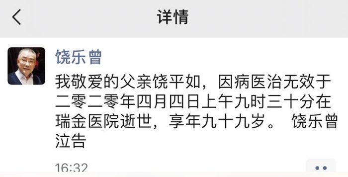 据饶平如先生第三子饶乐曾消息,《平如美棠》作者饶平如于4月4日上午九时三十分,在瑞金医院逝世,享年九十九岁。记者从出版方也确认了这一消息。饶平如先生上个月因胆囊疾病入院,住院后突发多器官衰竭。