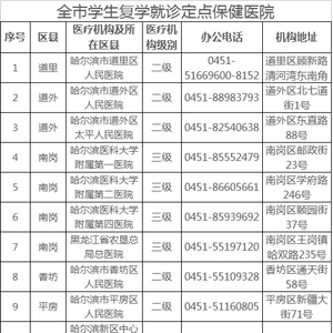 为进一步做好新形势下学校新冠肺炎疫情防控工作,哈尔滨市确定22家二级以上医疗机构作为复学后学生就医定点保健医院,全面保障复学学校师生的健康。哈尔滨市卫健委根据各区县(市)医疗资源分布和学校位置,将22家二级以上医疗机构定为就医定点保健医院。