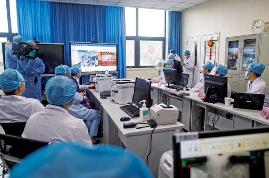 广东医疗队武汉前方ICU团队在武汉协和医院西院与后方广州医科大学附属第一医院举行远程视频会诊。图/新华社