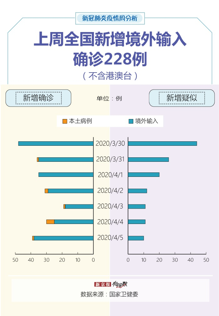 上周(3月30日-4月5日),全国(以下除特殊标注外,不含港澳台数据)共新增238例新冠肺炎确诊病例,其中228例为境外输入确诊病例,占同期新增总数的95%以上。