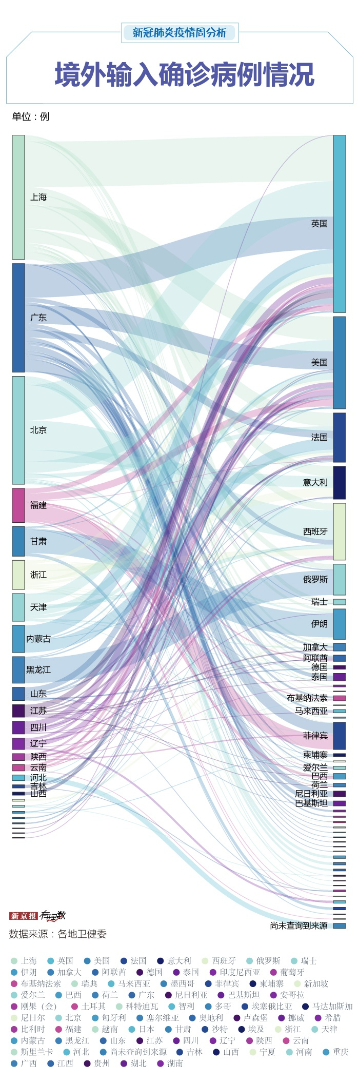从输入来源看,除未查询到相关来源的8例外,英国、美国输入我国的确诊病例最多,分别为284例和147例,占全部境外输入确诊病例的45%以上。