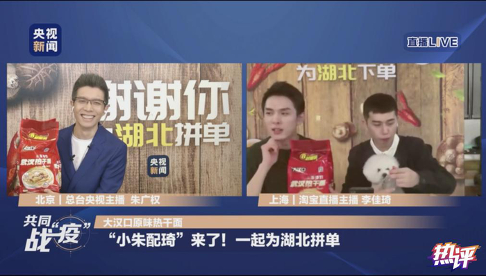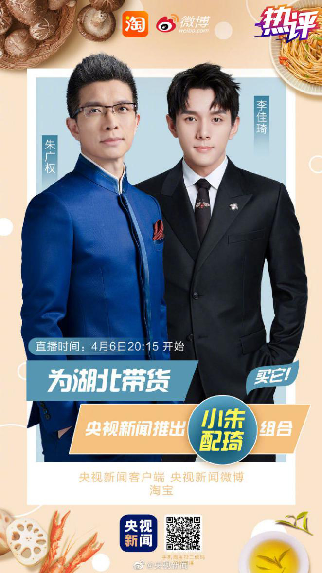 就在4月6日20:15,央视新闻主播朱广权和李佳琦带来“谢谢你为湖北拼单”公益直播。对于这对同框的搭档,网友们风趣地称为“小朱配琦”。
