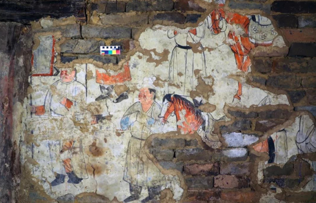 前室壁画《牵马迎宾图》。青海乌兰泉沟吐蕃时期壁画墓前室和后室均绘壁画,内容有武士牵马迎宾、宴饮舞乐、狩猎放牧、宫室帐居、山水花卉等内容。