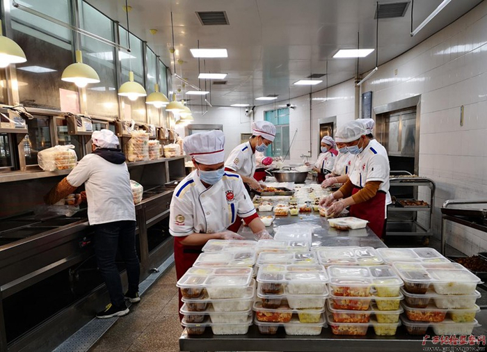 市第三中学食堂的师傅们正在分装盒饭,把特殊的关爱送到师生们手上 (摄影 孙振)