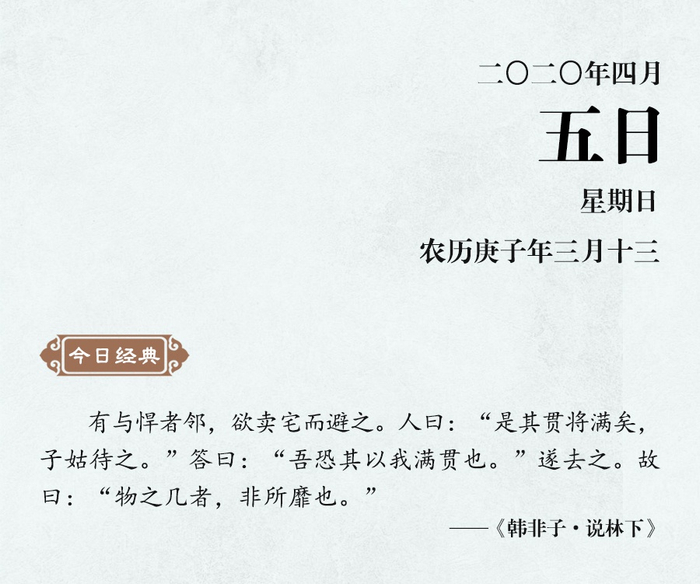 韩非对于这个成语则有更为特别的解说。“悍邻”之“恶贯”将满,那么是否可以等待其“满盈”呢?答曰:“吾恐其以我满贯也。”是否“满盈”尚不可知,但自己很可能成为“悍邻”最后的“绝杀”。这样看来,“卖宅避邻”到底还是一个好办法。“说走咱就走”,果断之余,还平添了几分未雨绸缪的智慧。如果犹豫不决,最后一分恶可能就要他自己来承受了。不过奇怪的是,此人既然如此明智,他怎么又会与“悍者”为邻呢?这个矛盾大概韩非并没有想到。