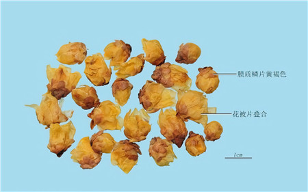 腊梅花:干燥花蕾呈圆形、矩形或倒卵形,长1~1.5cm,宽约0.4~0.8cm,气香,味微甜,后苦,稍有油腻感。解毒清热,理气开郁。主暑热烦渴,头晕,胸闷脘痞,梅核气,咽喉肿痛。主产江苏、浙江、四川、贵州等地。