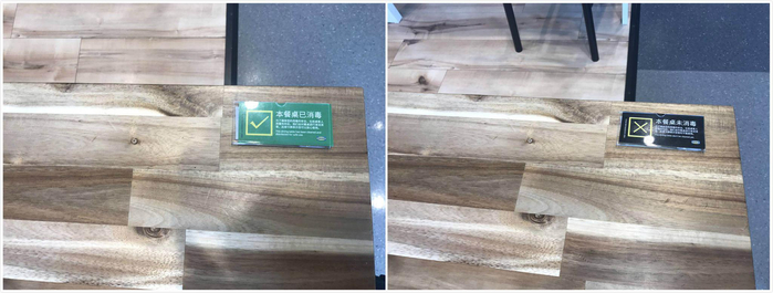同时,新京报记者注意到,餐桌上设置了消毒提示牌,餐厅引导员会将顾客引领至已消毒餐桌,待用餐完毕后会将提示牌翻转至提示未消毒的黑色面。