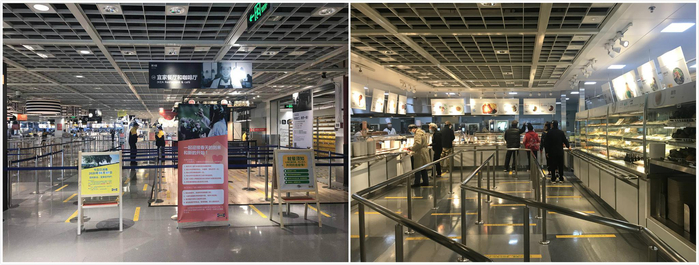 宜家北京四元桥店、西红门店的宜家餐厅和小餐馆恢复营业,座位缩减,餐厅采用半开放式售卖方式。