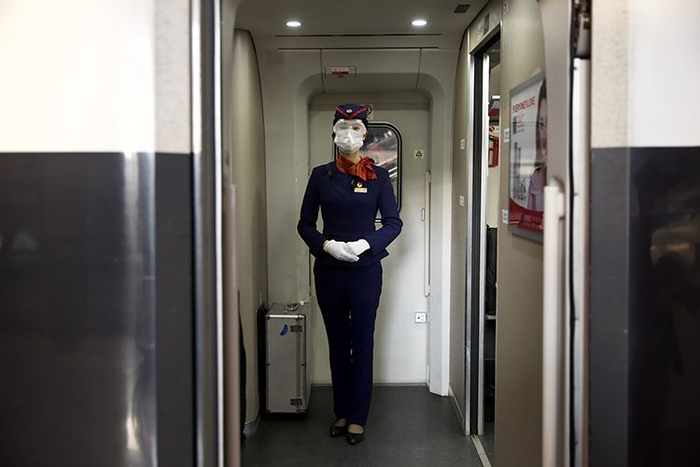 G431次列车乘务员戴着口罩、手套与护目镜。