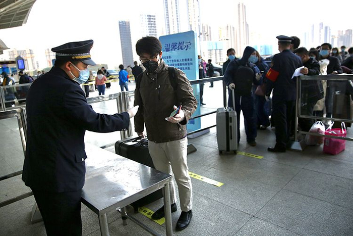武汉站外,旅客排队出示健康码进站。