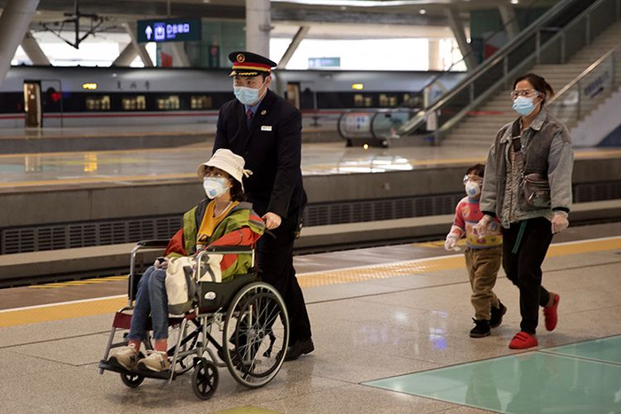 车站工作人员帮助行动不便的旅客进站乘车。